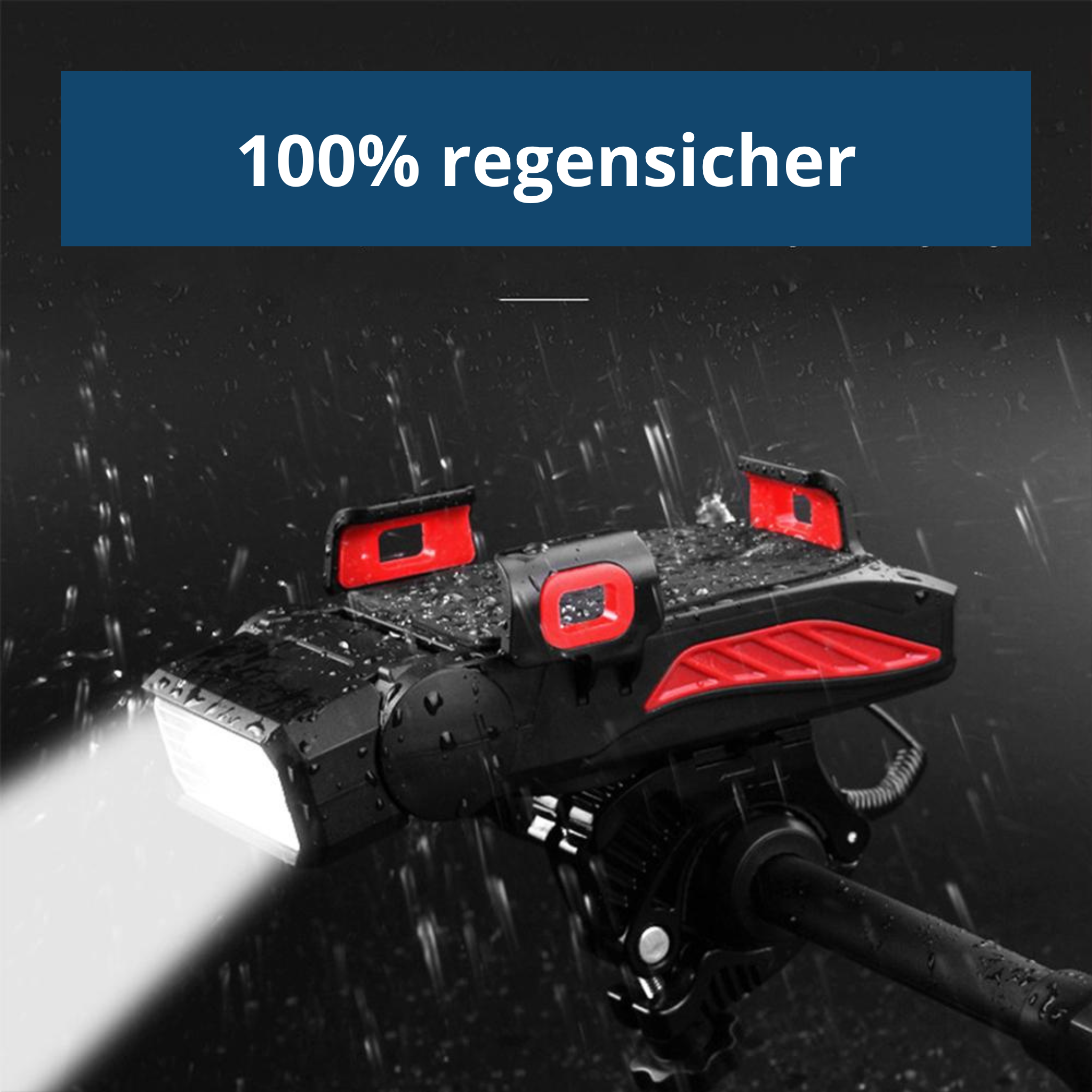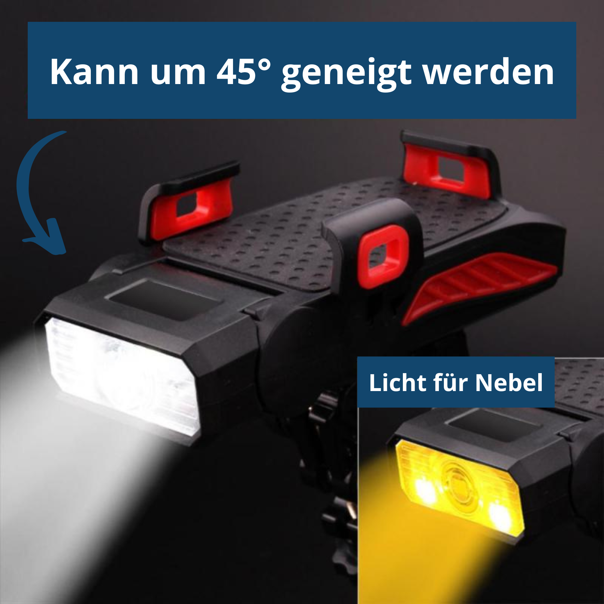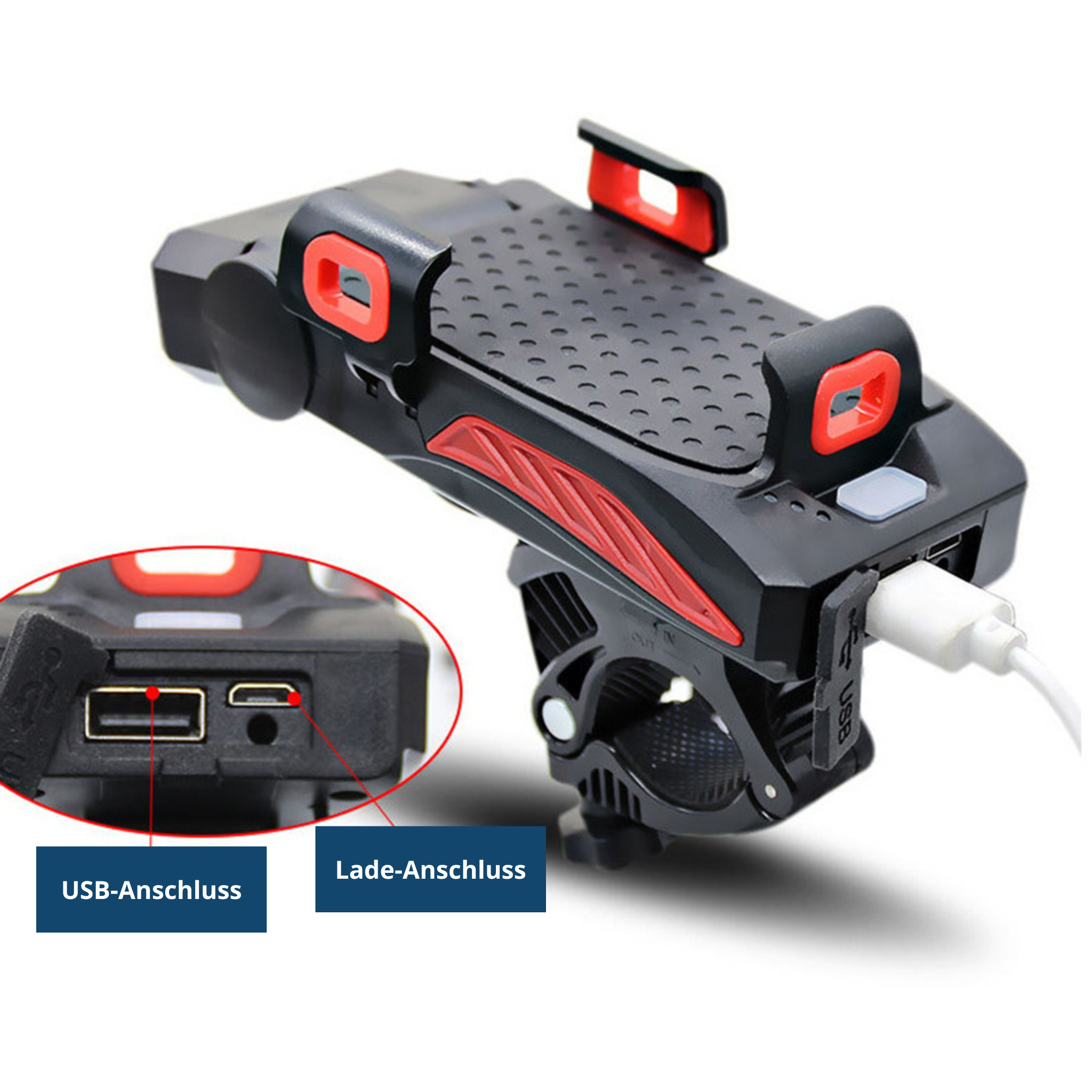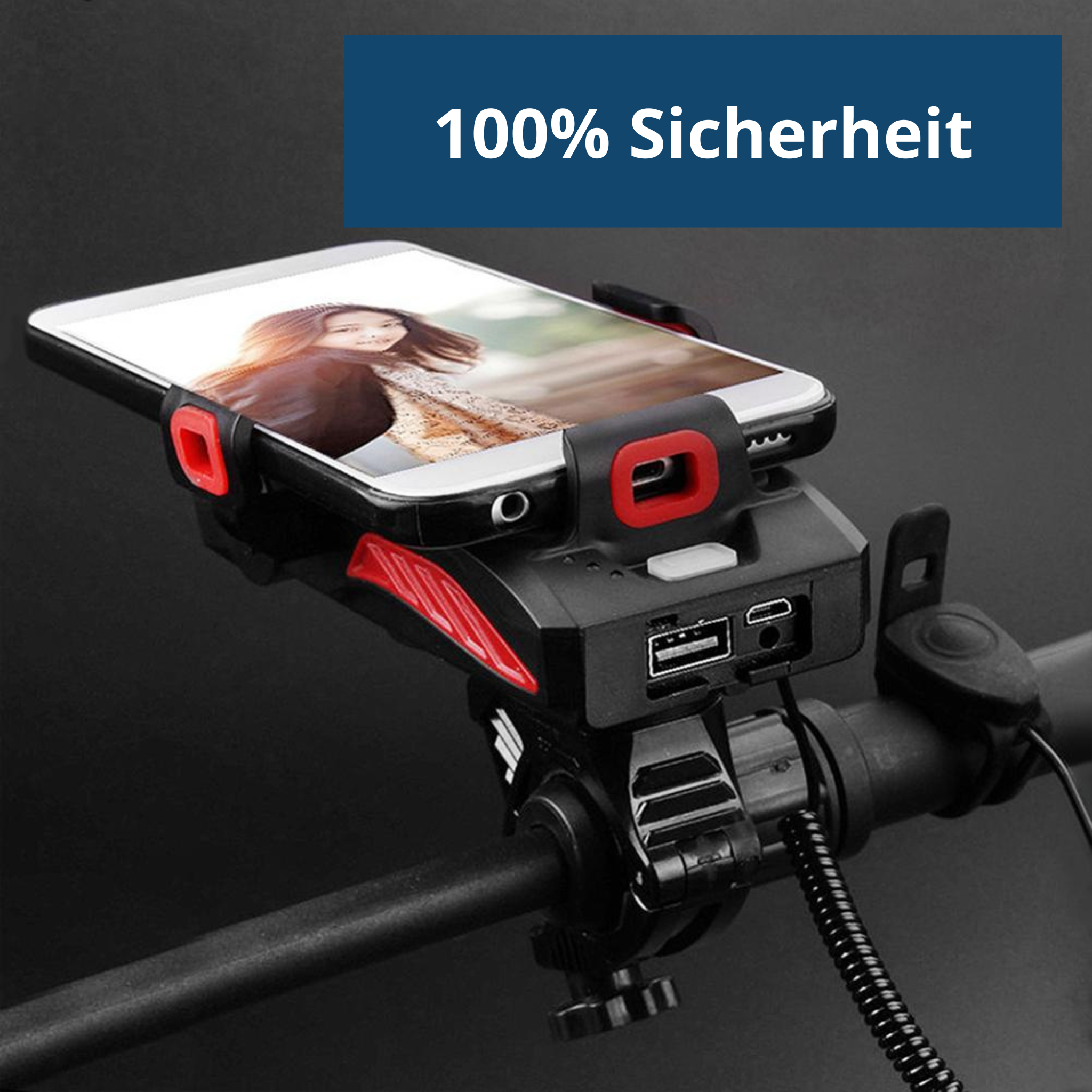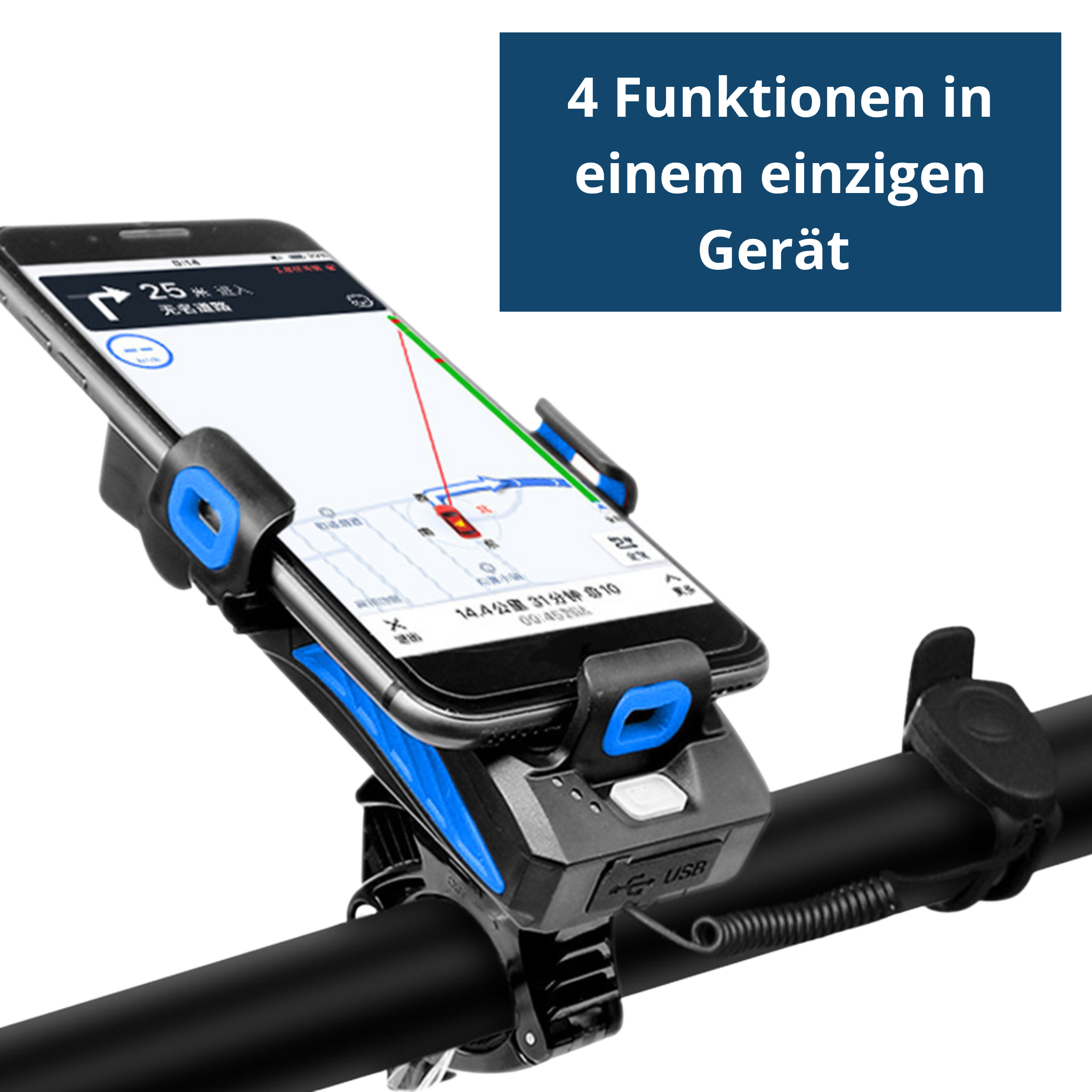 Sie kombiniert eine hochwertige Handyhalterung, mit einem ultra-hellem Licht, einer leistungsstarken Ladestation und einer elektrischen Klingel.