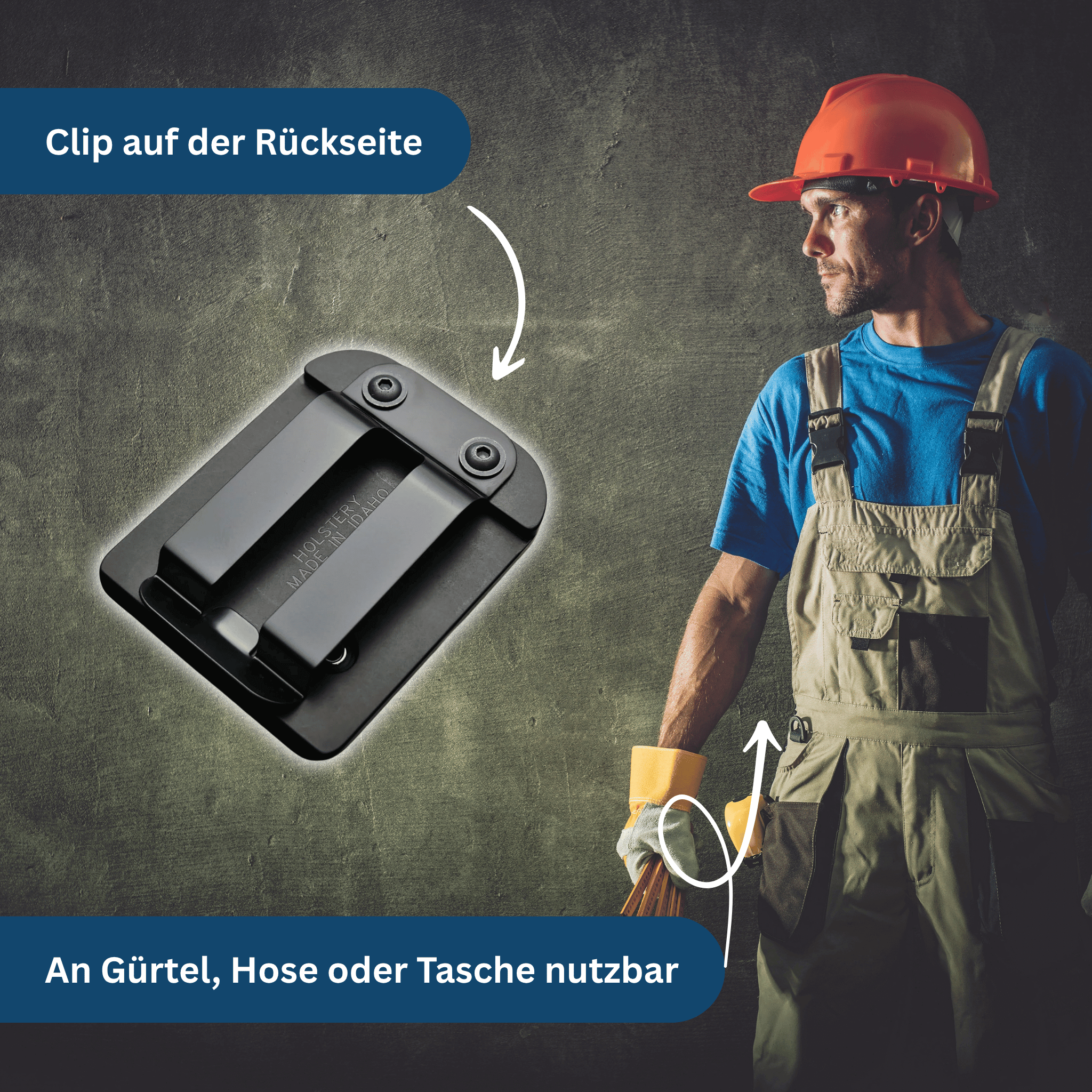Dank des Clips auf der Rückseite lässt sich der Werkzeughalter direkt an Gürtel, Hose oder Werkzeugtasche befestigen, ganz ohne zusätzliches Befestigungsmaterial.