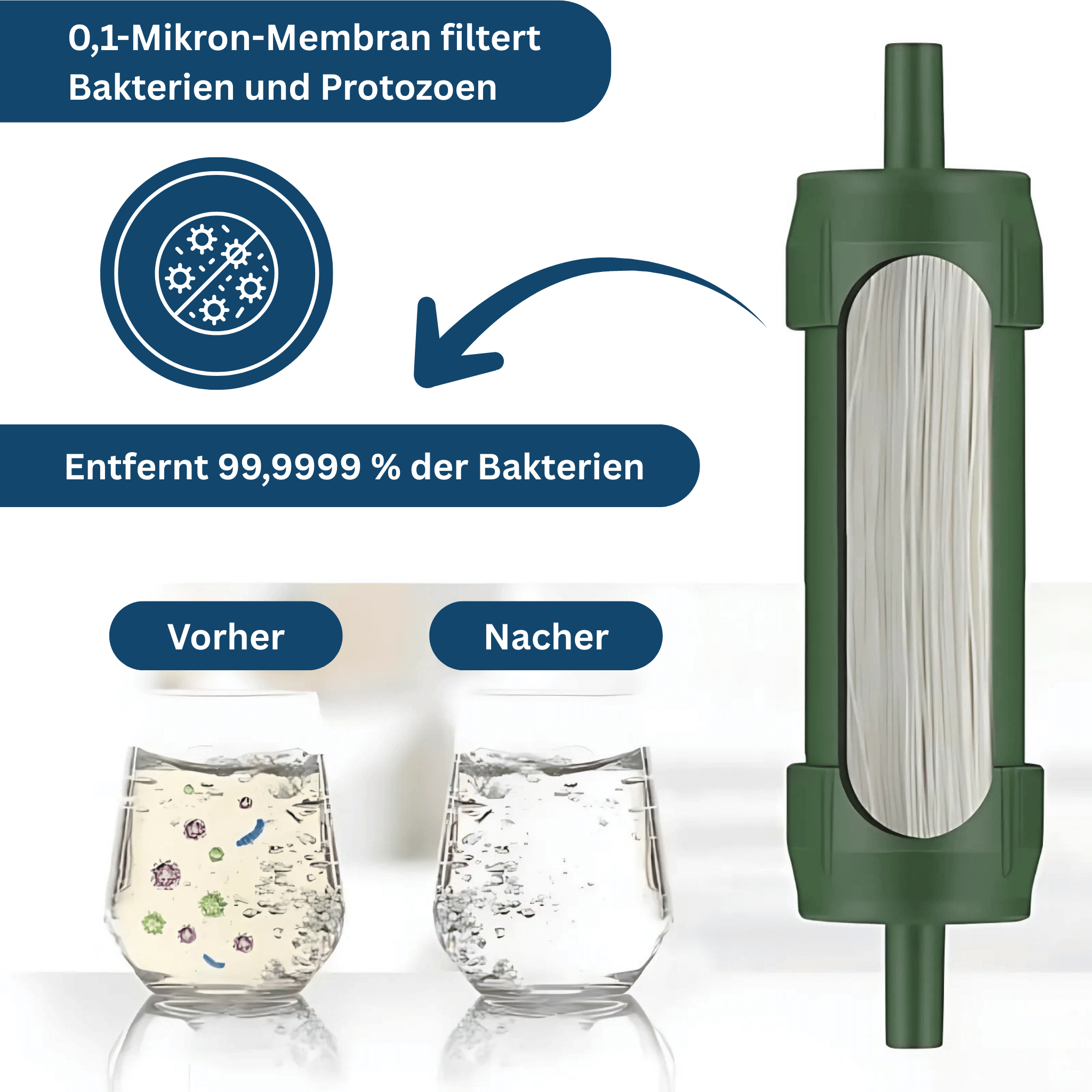 Die eingebaute 0,1 Mikron Membran filtert zuverlässig Bakterien und Protozoen heraus.
