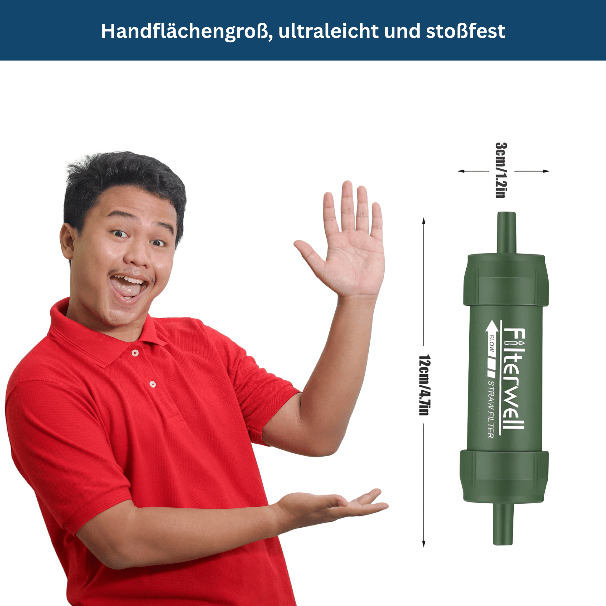 Der Filter ist kompakt, ultraleicht und stoßfest, passt in deine Handfläche und lässt sich durch einfaches Rückspülen viele Male wiederverwenden.