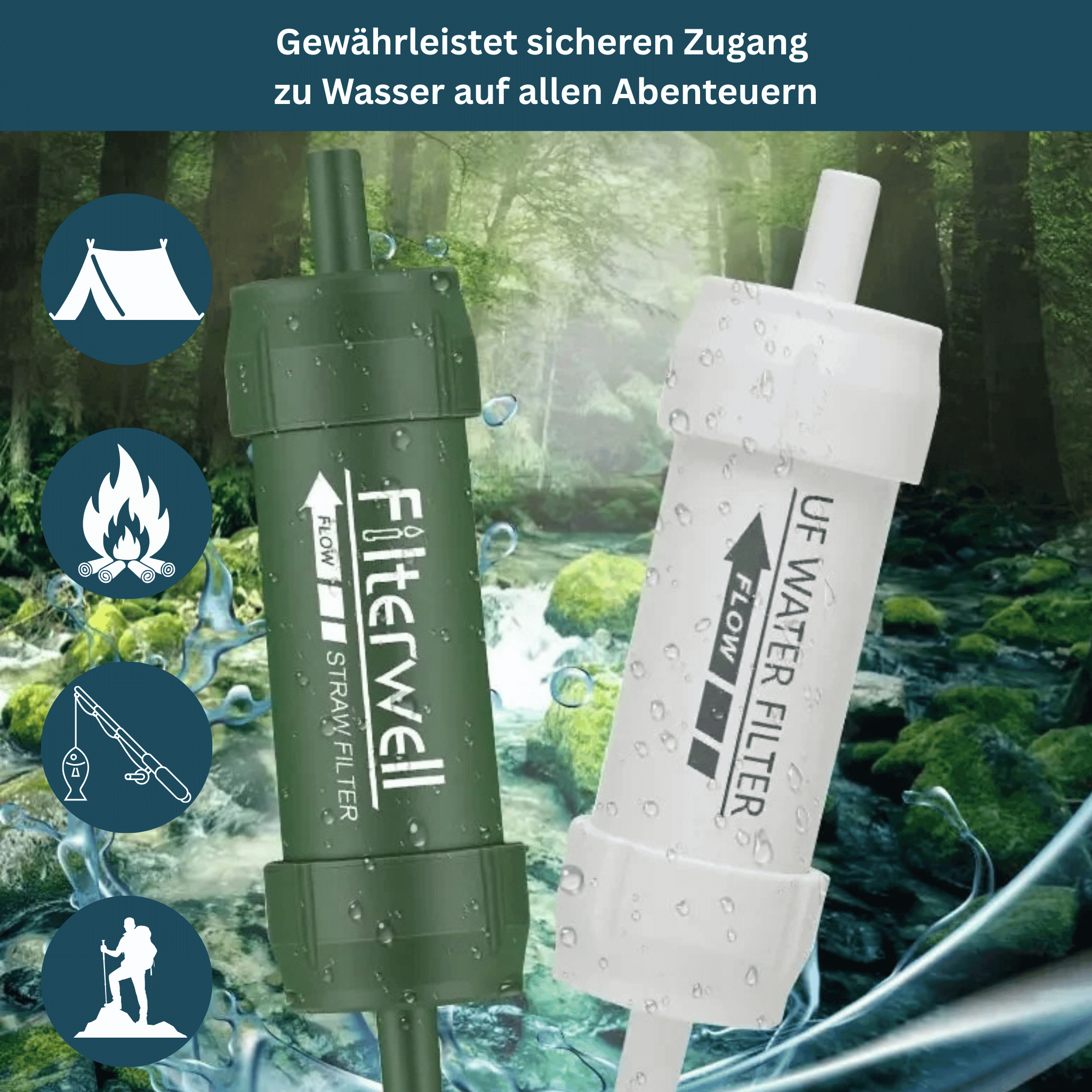 Er ist ideal für Camping, Wandern, Angeln, Reisen, Outdoor-Abenteuer und auch für Notfälle – überall, wo du zuverlässigen Zugang zu sauberem Wasser brauchst.