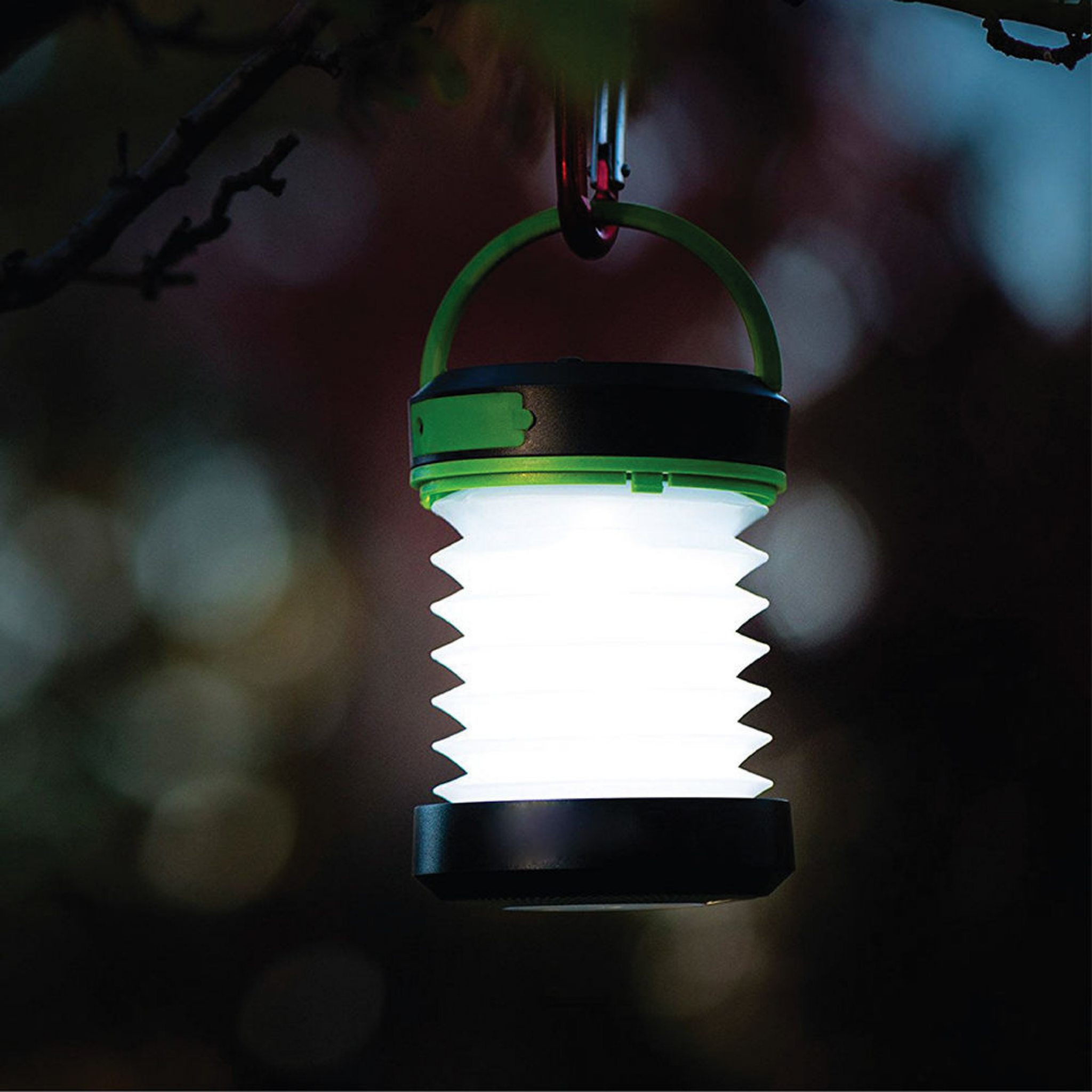 Die faltbare Bauweise und der integrierte Aufhängehaken machen die Laterne besonders flexibel.