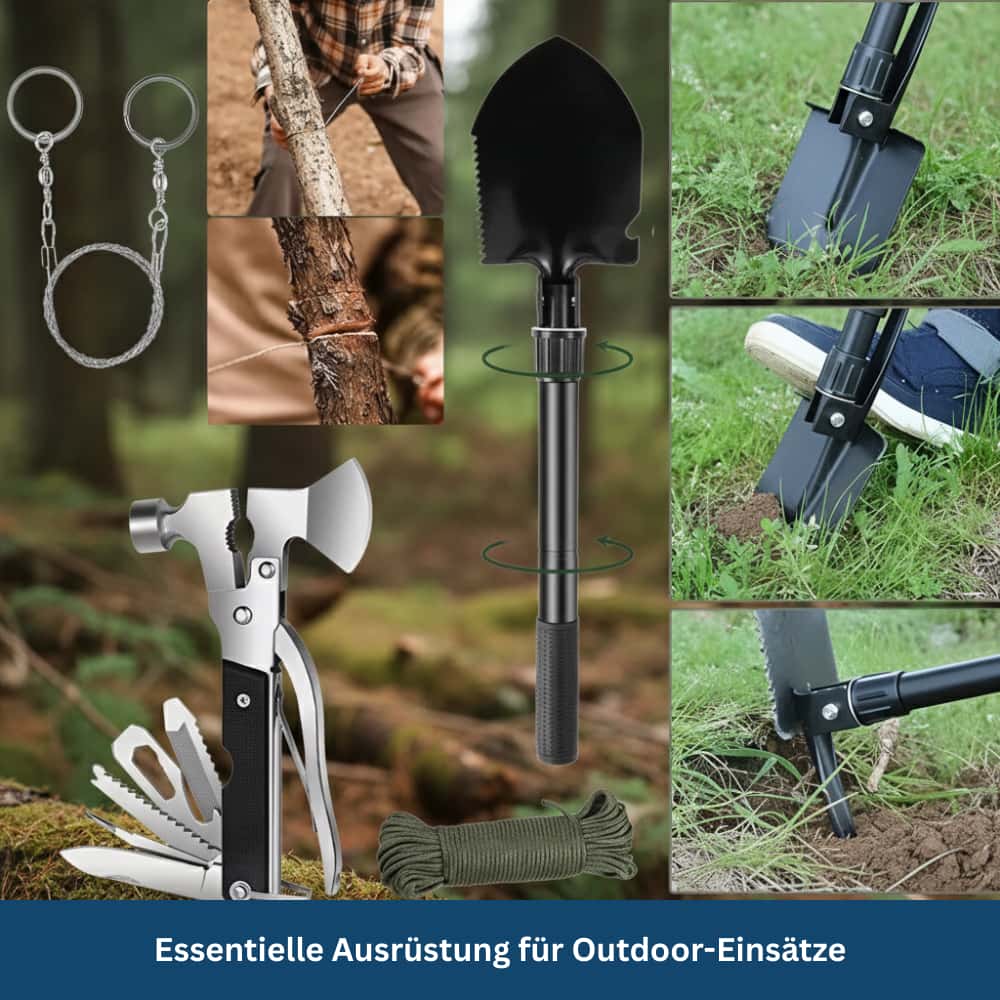 Die enthaltene Axt, der Hammer und die Schaufel unterstützen dich beim Schneiden, Spalten und Graben, während du gleichzeitig auf eine stabile Drahtsäge, ein reißfestes Sieben Kern Paracord Seil, ein praktisches Notfallzelt sowie einen zuverlässigen Funkenstein zugreifen kannst.