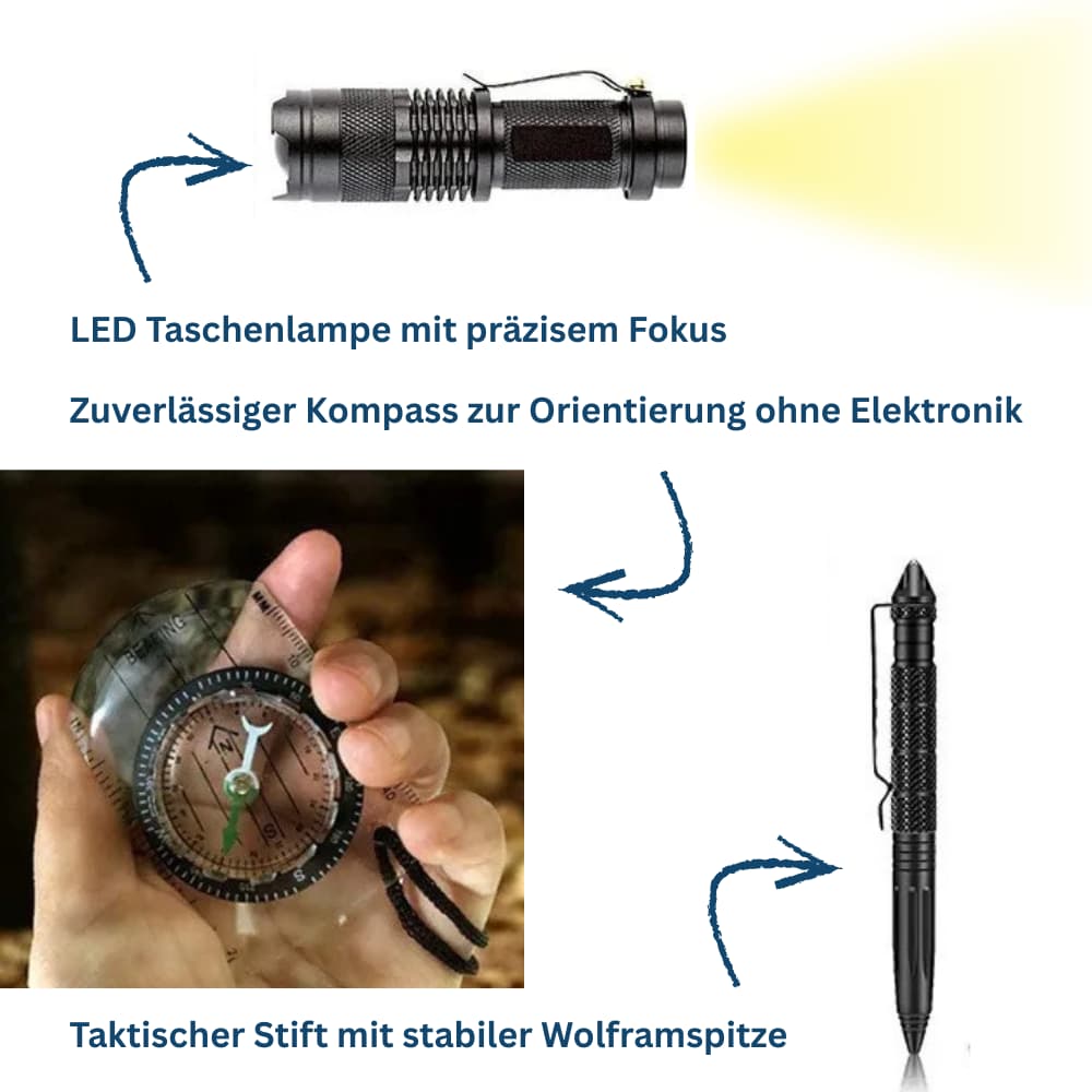 Dieses Set vereint umfassende Erste Hilfe Ausstattung, hochwertige Survival Werkzeuge und praktische Outdoor Essentials, auf die du dich jederzeit verlassen kannst.