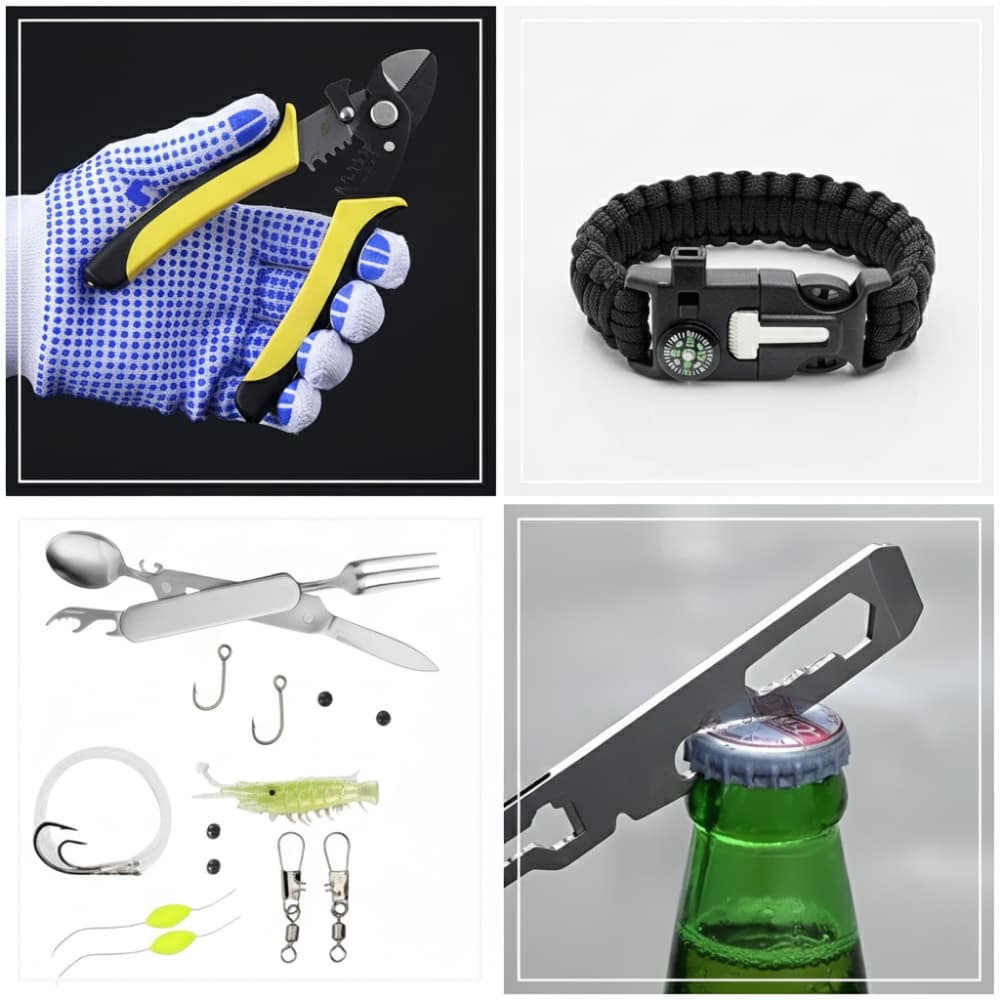 Ergänzt wird das Set durch ein vielseitiges Angelwerkzeug, rutschfeste Handschuhe, eine Wasserflaschen Schnalle, ein funktionales Multifunktionsbesteck sowie ein kompaktes Paracord Armband, das mehrere praktische Funktionen vereint.