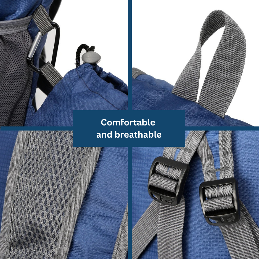 The Compact backpack is characterized by its breathable shoulder straps, ensuring a comfortable wearing experience even during extended periods. Additionally, it is foldable and can be stored compactly to save space. A side bottle holder also provides easy access to your drinks while on the go.