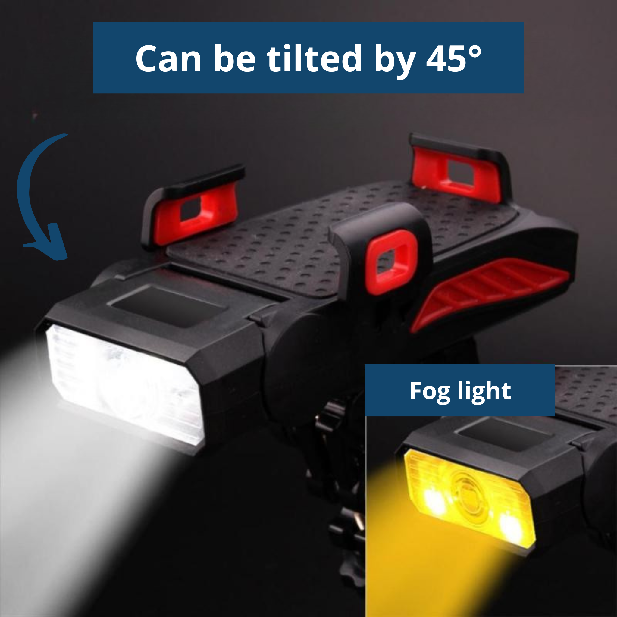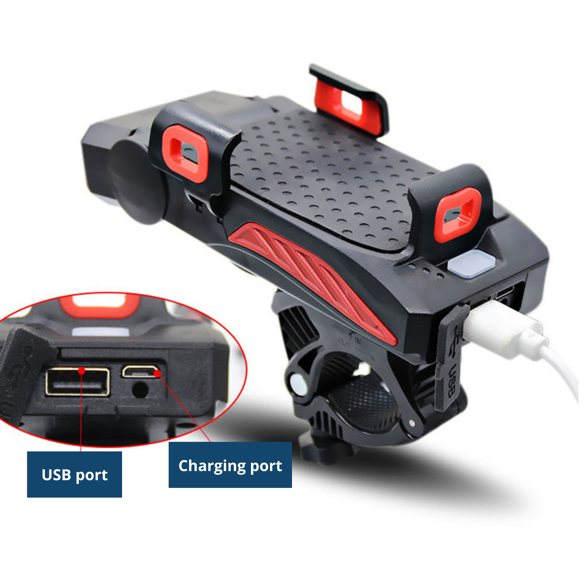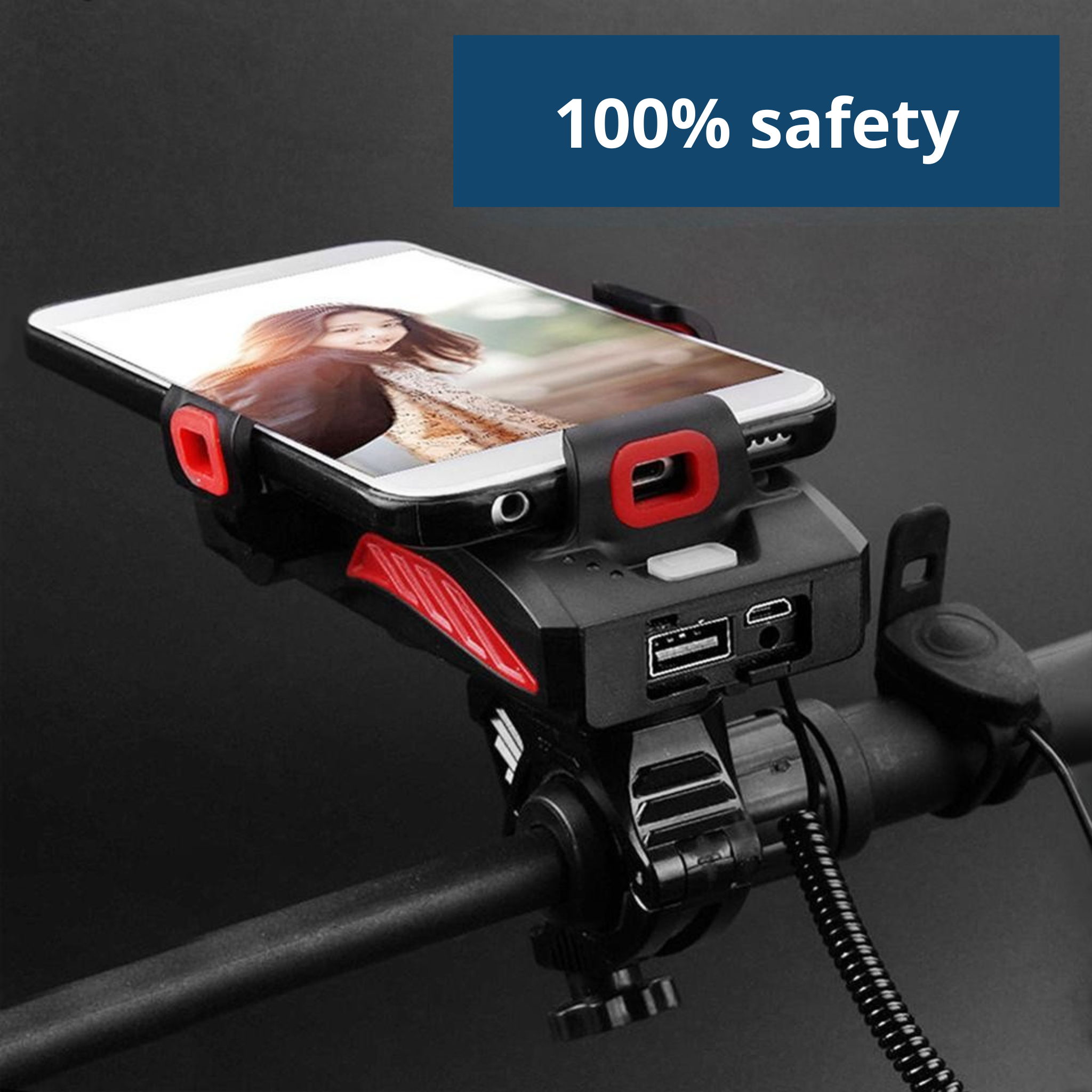 It combines a high-quality phone holder with an ultra-bright light, a powerful charging station, and an electric bell.