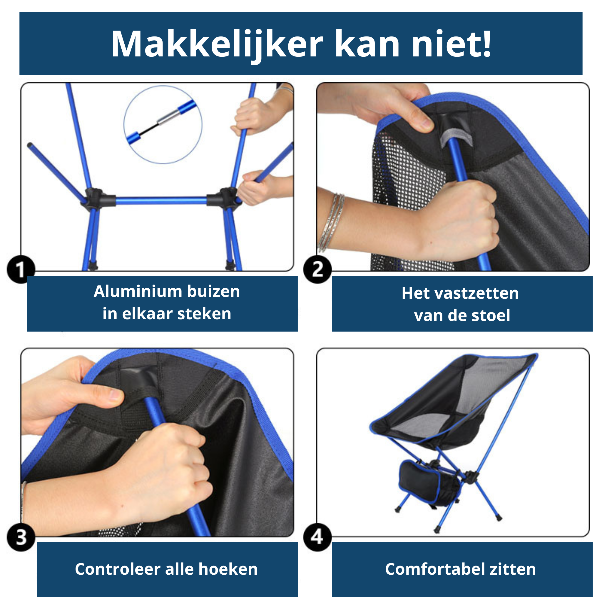 Dankzij het eenvoudige plug-in systeem is onze NaturVibes Comfy kampeerstoel razendsnel en eenvoudig op te zetten.