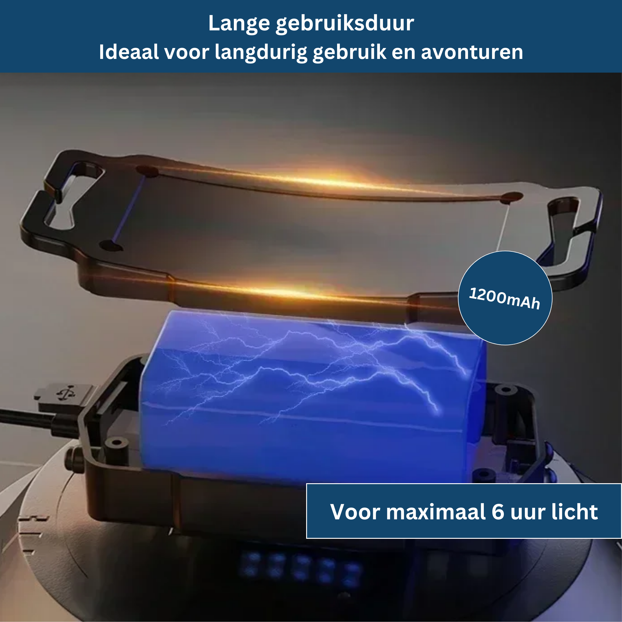 De Blaze-hoofdlamp gaat tot wel 6 uur mee dankzij de 1200 mAh-batterij.