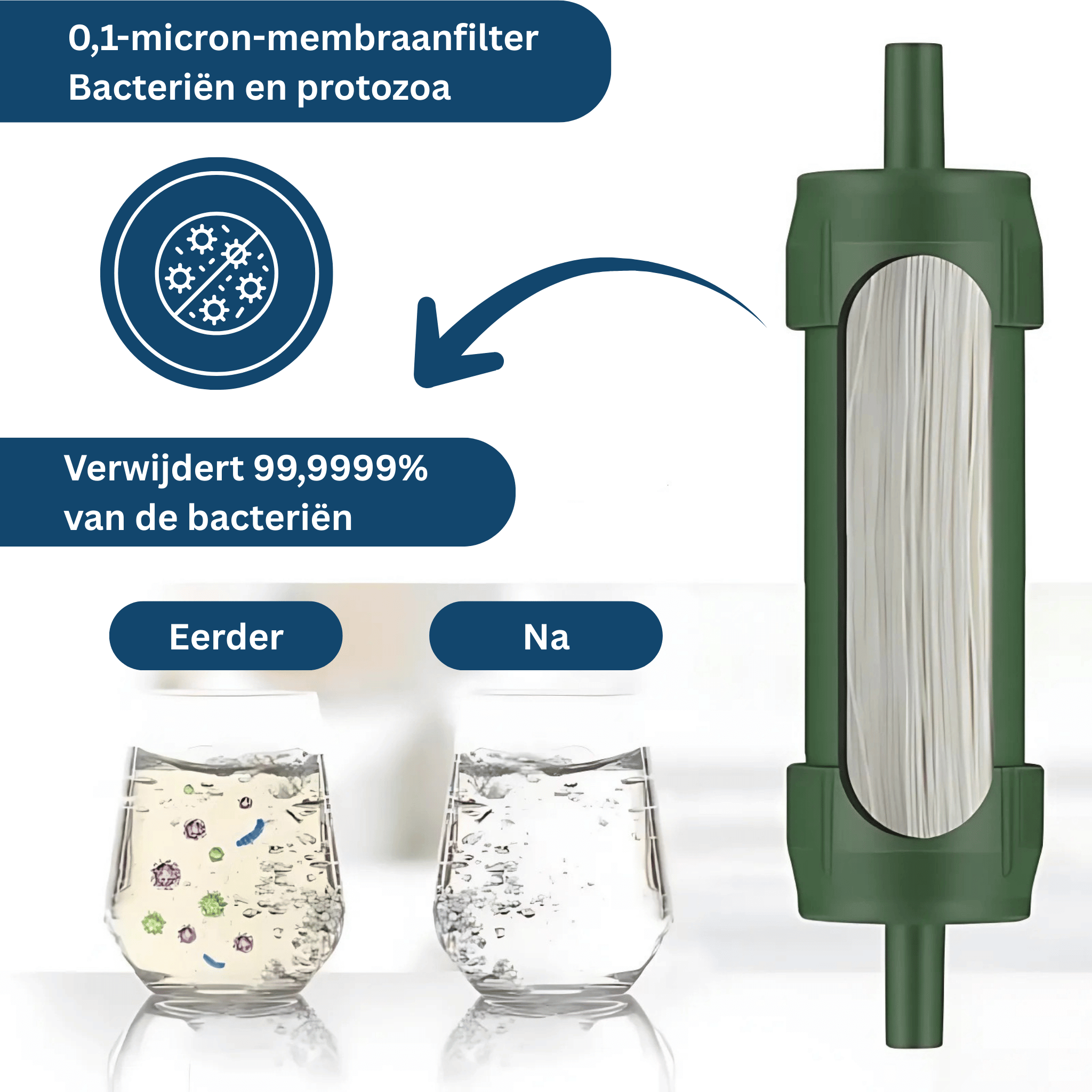 De ingebouwde 0,1-micron membraan filtert betrouwbaar bacteriën en protozoa.