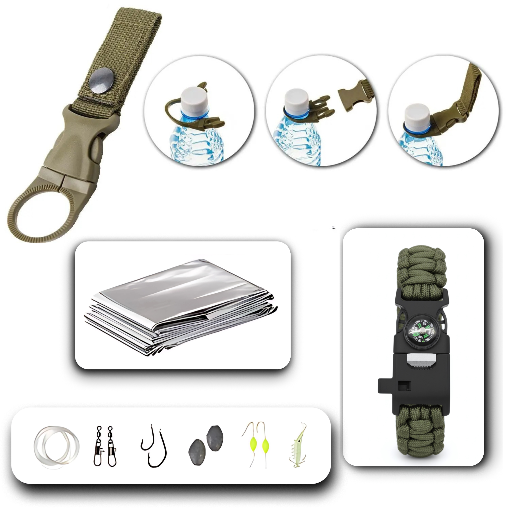 De set wordt aangevuld met handige extra’s zoals de bottle clip, een duurzaam paracord armband en een kleine visaas.