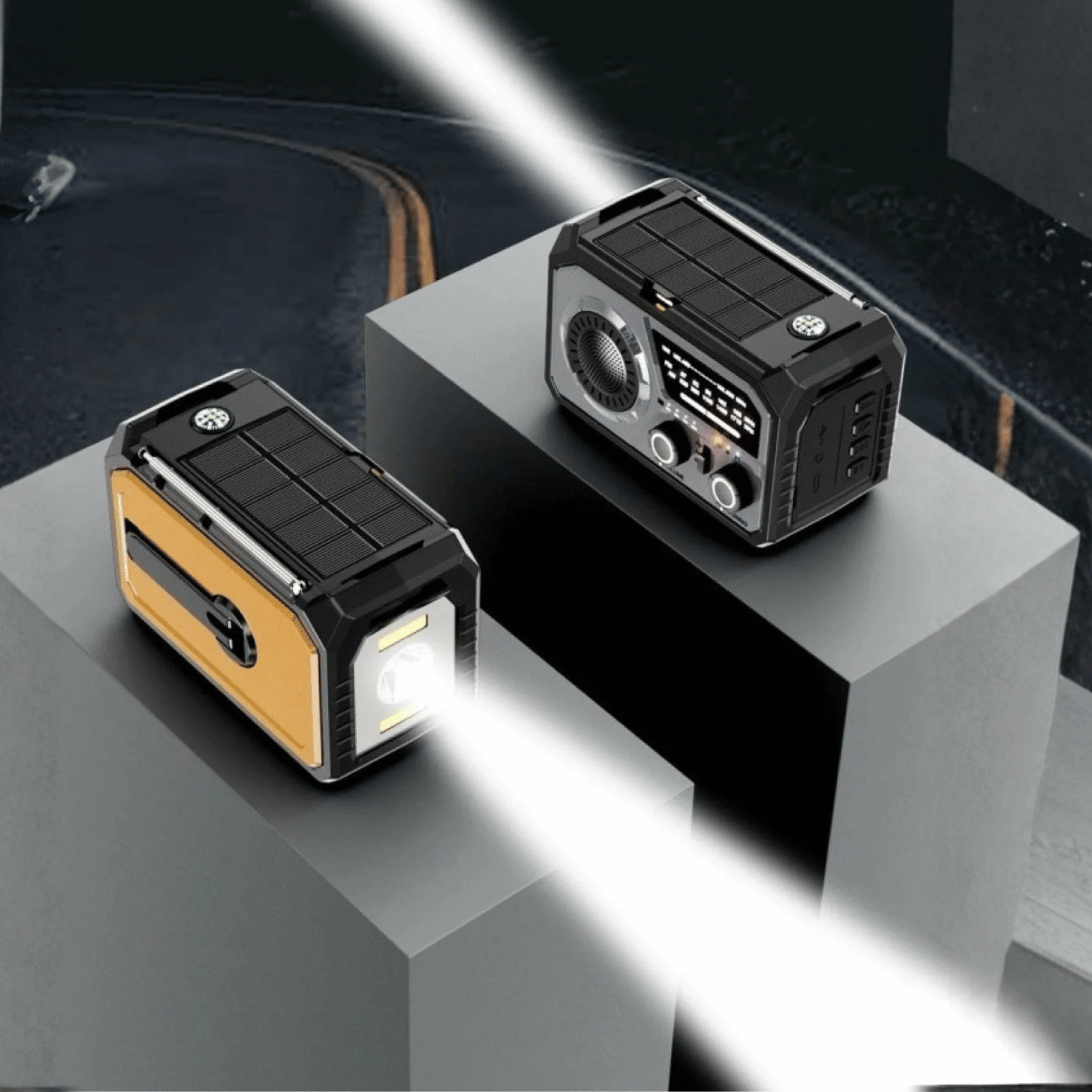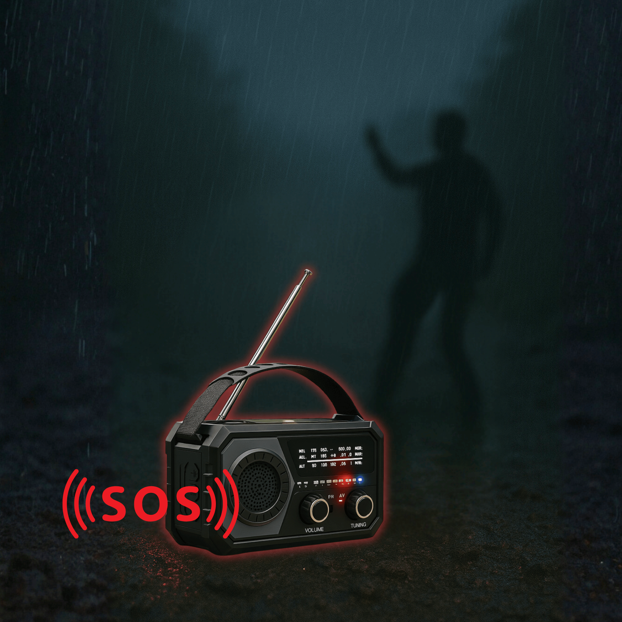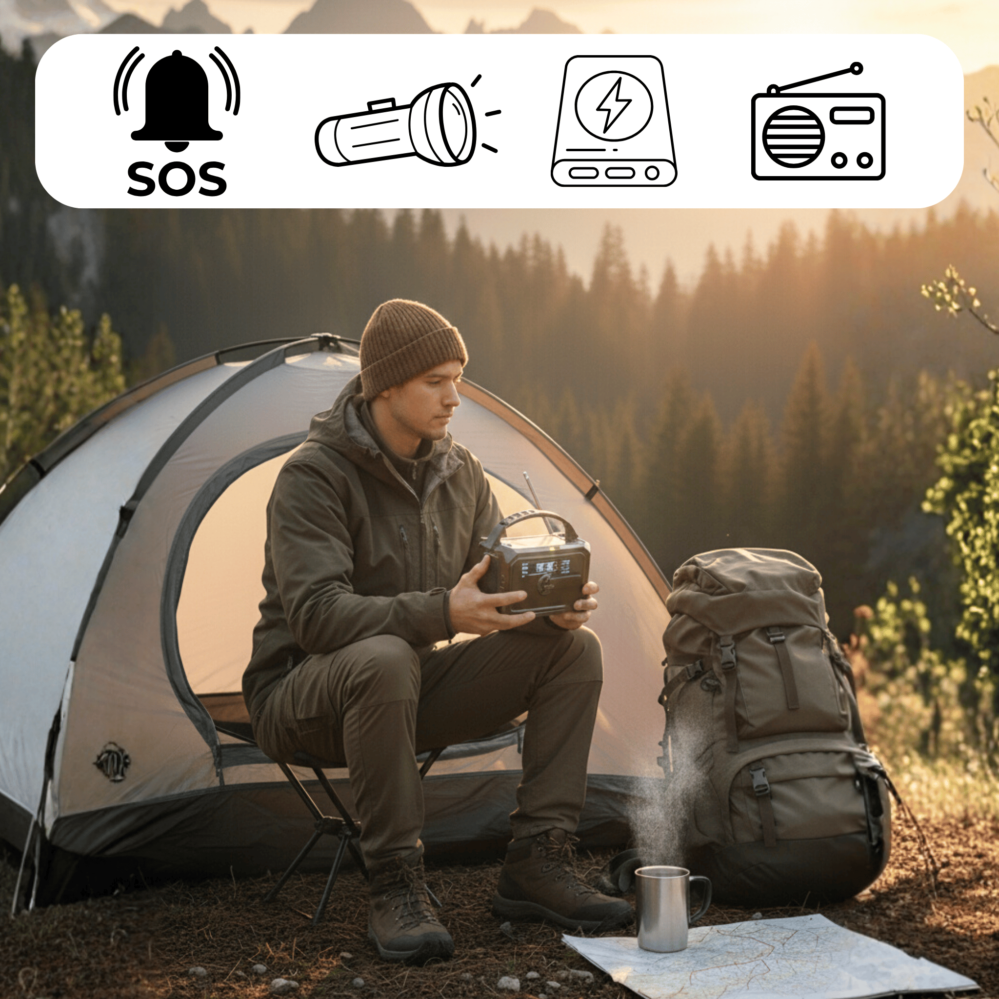 Deze veelzijdige alleskunner combineert een radio, zaklamp, powerbank, Bluetooth-luidspreker en SOS-alarm in één compact en robuust ontwerp.