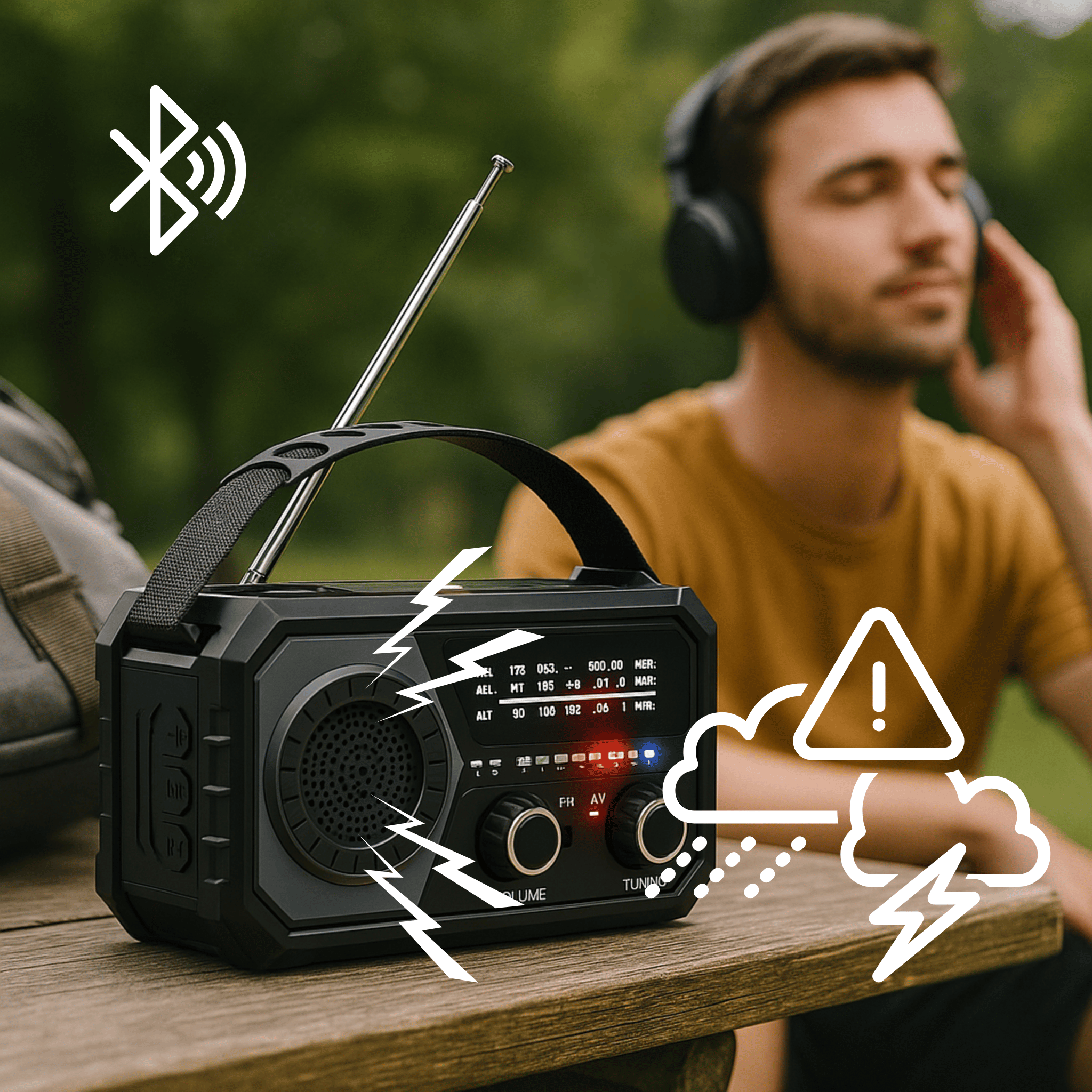 Het apparaat ontvangt AM-, FM- en NOAA/WB-radiosignalen. Zo blijf je altijd op de hoogte van weerswaarschuwingen, nieuws en noodmeldingen, zelfs in afgelegen gebieden.