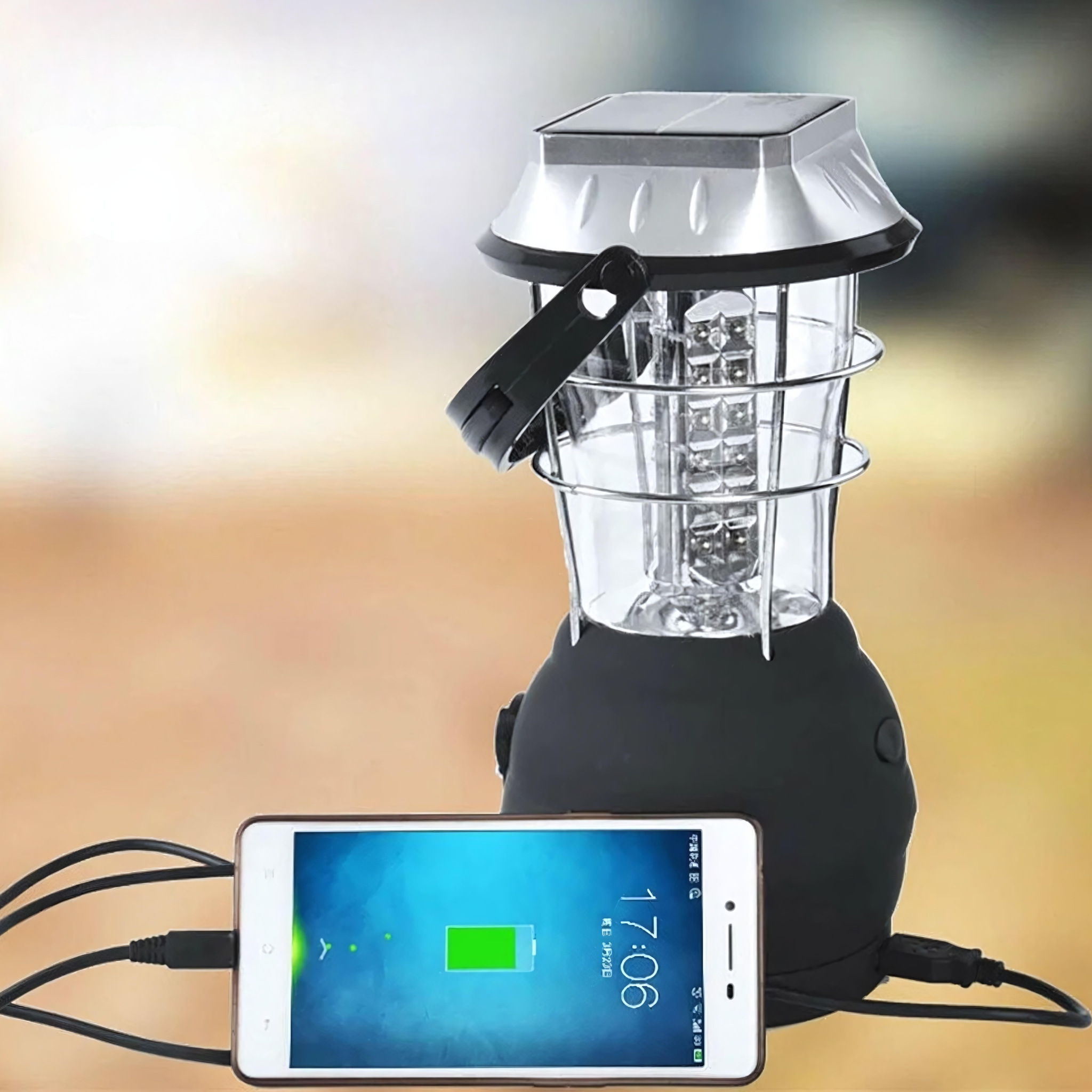 Je kunt de lamp opladen via zonne-energie, betrouwbare noodstroom genereren met de handdynamo, of aansluiten via USB op een powerbank of stopcontact.